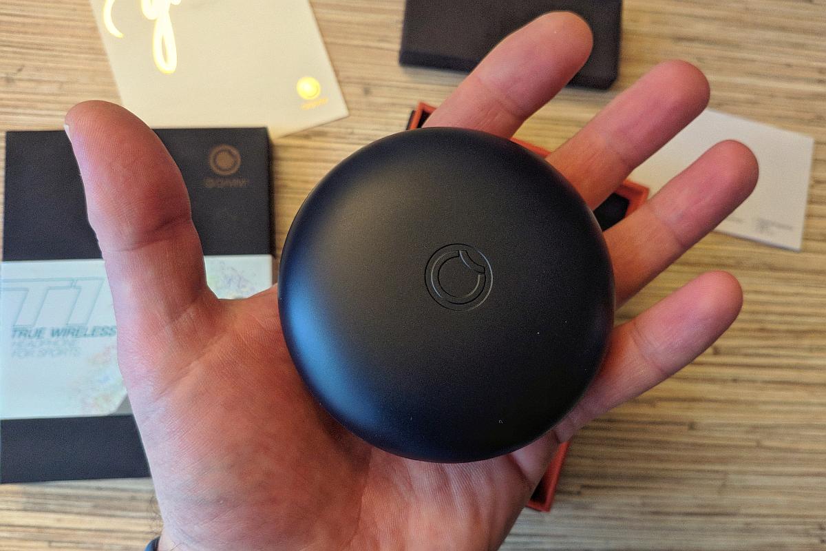 Бокс с наушниками (85×30 мм, 75 грамм), после миниатюрной коробчонки Floveme, показался огромным. Эдакая тёмно-синяя пудреница или галька – кому, как нравится. Но тактильно штука приятная. 😉