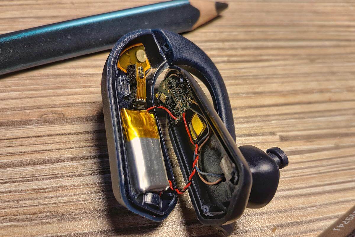 Раздербанить наушник оказалось сложнее. Крепление “одноразовое”: проклейка по периметру и отламывающиеся пластиковые штырьки-направляющие.